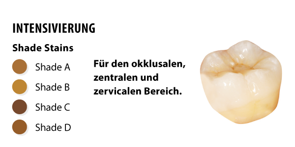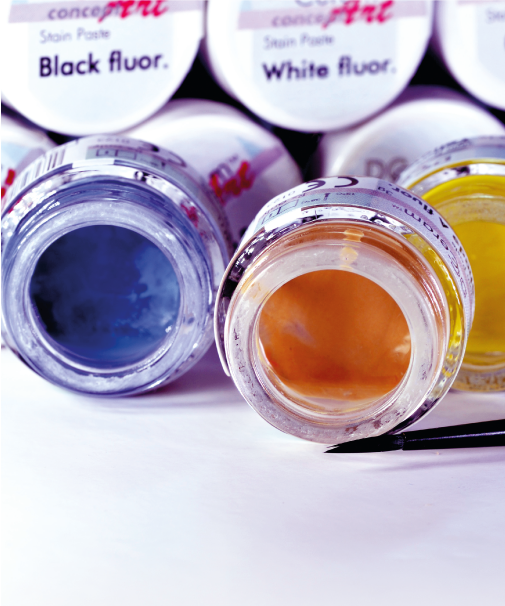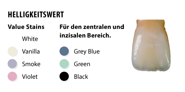 Durchdacht und logisch aufgebaut: Das Konzept des conceptArt Malfarbensystems. Farben aus dem Chroma- (Shades), Value- und Modifier Bereich sind perfekt auf keramische Restaurationen abgestimmt. Sie ermöglichen dem Zahntechniker einfachste Charakterisierung und zuverlässige Farbgebung in jedem Bereich des Zahnes von zervikal bis incisal.