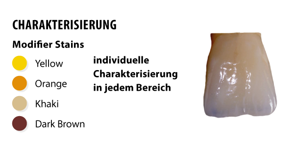 15 Malfarben aus dem Chroma-, Modifier-, und Valuebereich bieten alle Möglichkeiten der Individualisierung und Charakterisierung der vollkeramischen Restauration. Sowohl verblendete als auch monolitische Arbeiten können einfach und schnell zu höchster Ästhetik gebracht werden. Ideal auch für monolitische Arbeiten aus Zirkonoxid.